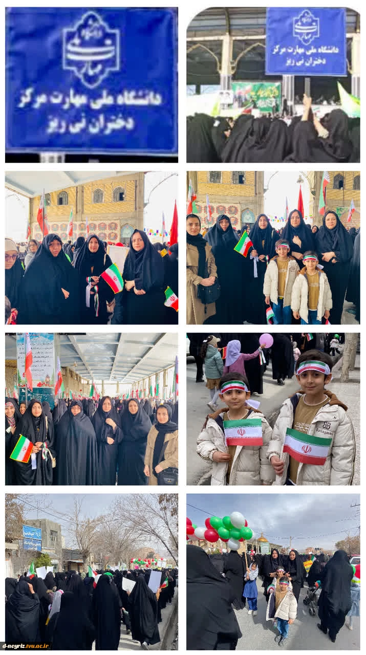 حضور ریاست و همکاران و اساتید آموزشکده دختران نی ریز در راهپیمایی ۲۲ بهمن ۱۴۰۴ گزارش جامعه دانشگاهی ، همگام و همدل با آحاد مردم، با شرکت در راهپیمایی باشکوه ۲۲ بهمن، پیوند ناگسستنی خود با ملت شریف ایران و عهد همیشگی خود با ارزشهای متعالی انقلاب اسلامی را بار دیگر تجدید میکند؛ حضوری که جلوهای روشن از بصیرت، امید، مسئولیتپذیری اجتماعی و نقشآفرینی دانشگاه در مسیر پیشرفت و تعالی کشور است. بیتردید، این حضور آگاهانه و وحدتآفرین، نهتنها یادآور شجاعت و ایستادگی دیروز ملت ایران است، بلکه ترسیمکننده مسیر فردا و پیامآور امید، اقتدار و آیندهای روشن برای ایران اسلامی خواهد بود.